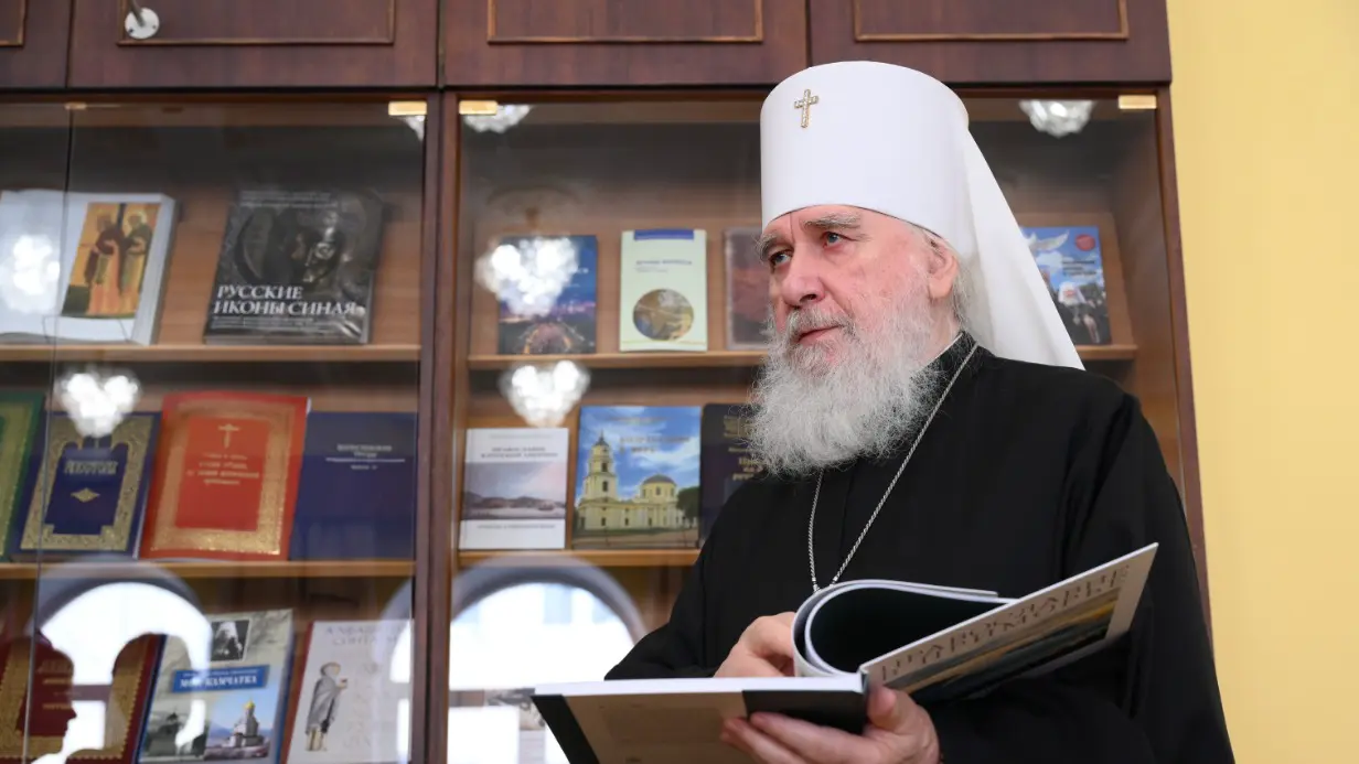 Председатель Издательского совета Русской православной церкви митрополит Калужский и Боровский Климент демонстрирует книгу «Православие в Приморье»