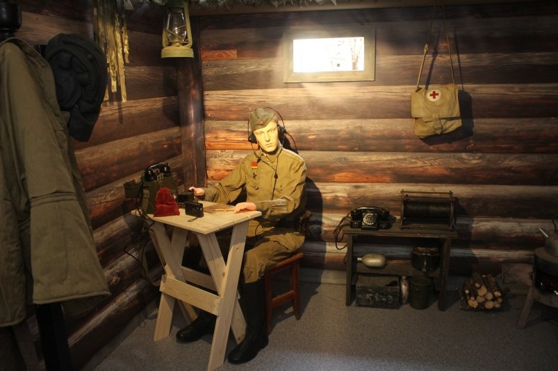 Сердце экспозиции — воссозданный блиндаж 1940-х. Среди реликвий: полевая аппаратура ленд-лиза, телефонная катушка с обожженными краями, патефон 1943 года и легендарная «боевая гармонь» — немые свидетели подвигов под огнём.