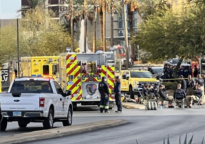 Спасатели на оцепленной территории возле отеля Trump International в Лас-Вегасе
