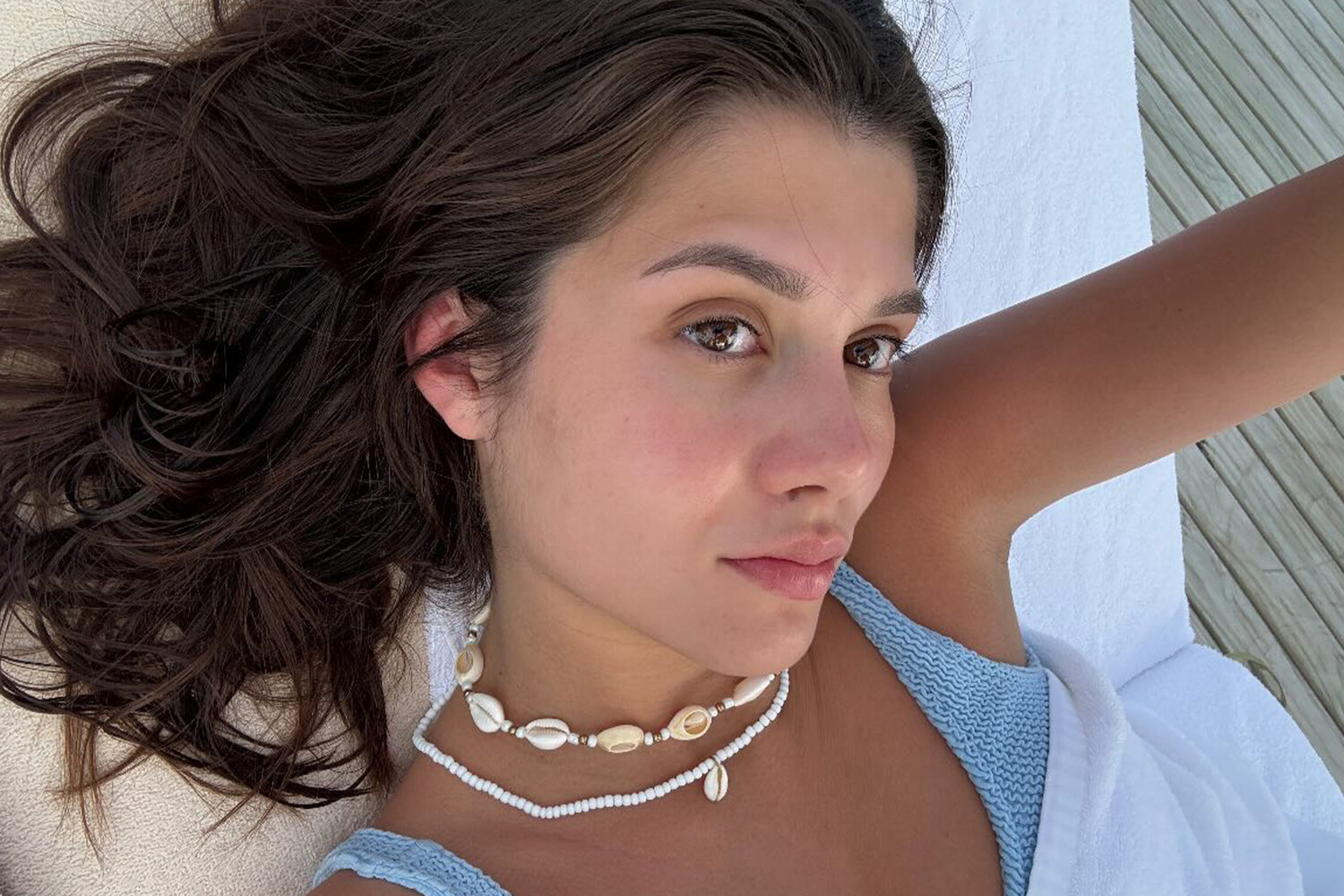 На солнечных снимках Виктория Антонова демонстрирует естественную красоту, расположившись на шезлонге в изящном голубом купальнике. Ее образ дополняют оригинальные украшения из морских ракушек, а распущенные волосы и отсутствие макияжа подчеркивают природное очарование будущей мамы.