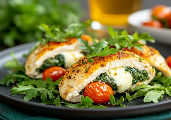 Наполните куриное филе волшебством вкуса: подготовьте свежие грудки, соус песто, моцареллу, черри, листья шпината и ваши любимые специи.